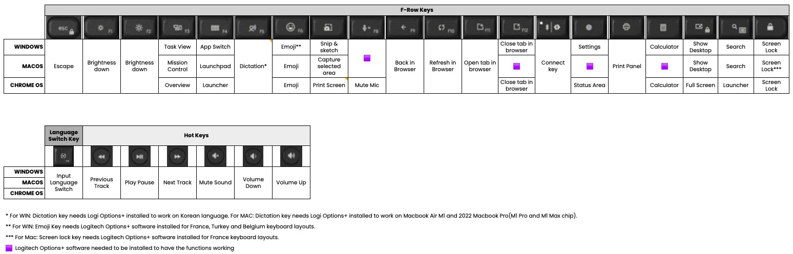 Most of the functions on your keyboard will NOT need Logitech Options+ to work, except for the ones with the purple square below: