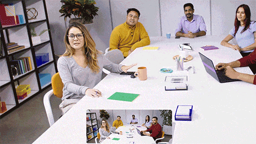 Showing the two views together gives remote meeting participants both a close up of the active speaker and situational context of what’s happening in the room. The picture-in-picture view gives remote meeting participants a persistent view of the entire room so they have situational context while they focus on the person actively speaking. Having both views approximates the experience of people in the meeting room, creating a more equitable video experience over all.