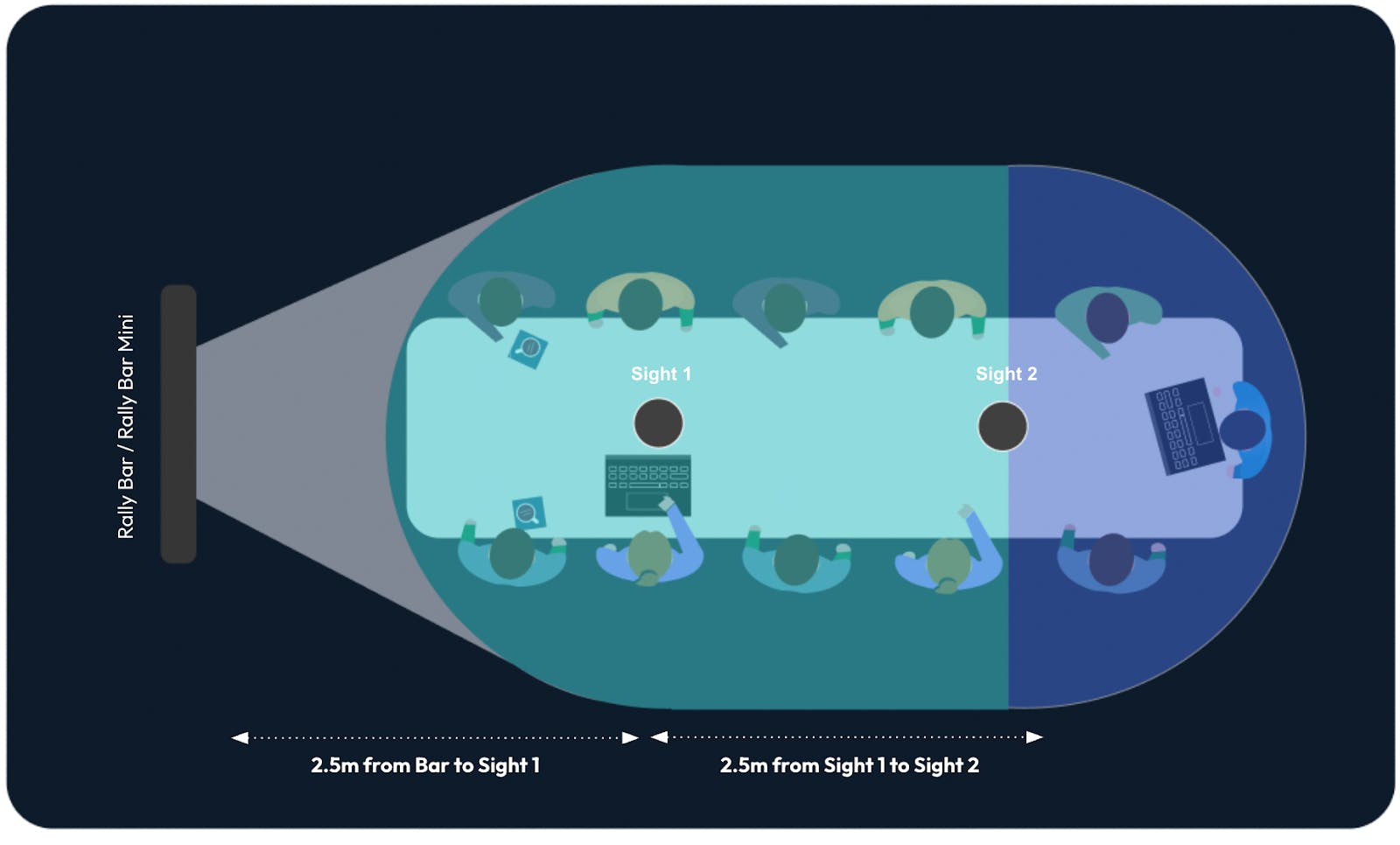 Dual Sight deployment extends coverage for longer tables or larger rooms by connecting two Sight cameras to Rally Bar or Rally Bar Mini, permitting broader participant framing with multiple camera angles.