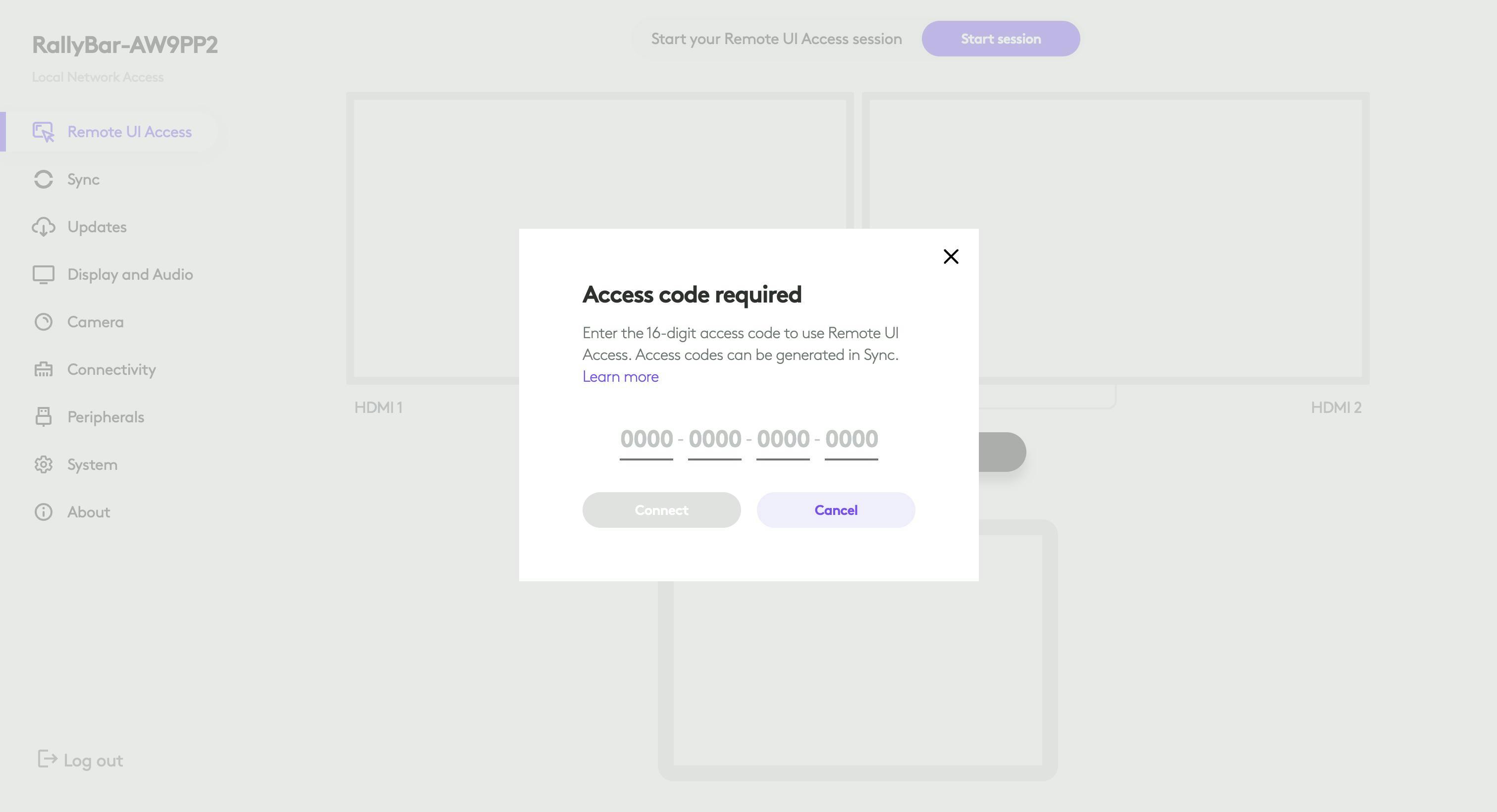 Authorized users will typically initiate a Remote UI Access session directly from the Sync portal. The device-specific access code will be seamlessly transferred to the device at that moment, and the session will start.