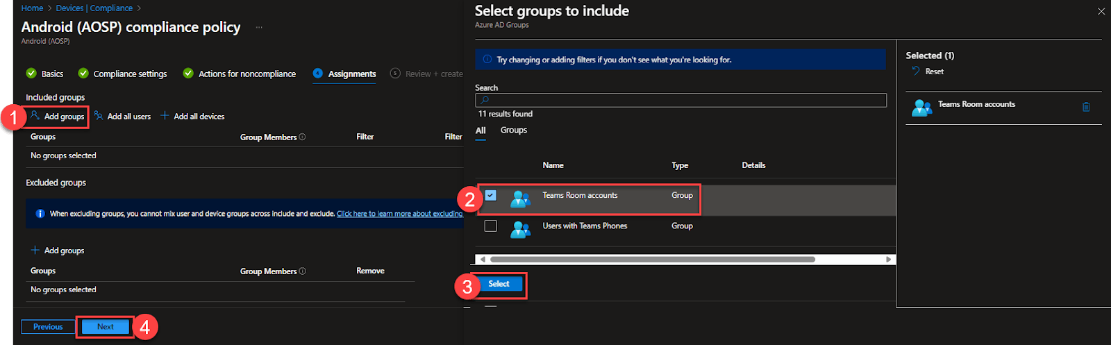 Under Assignments click Add groups, find and select the group which includes your Android room and device accounts. You should have one of these groups already if you have Android devices. Click Next