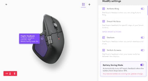 If you toggle on battery saving mode, haptic feedback turns off when your MX Master 4 reaches 10% battery level. Turning haptic feedback off reduces your battery consumption. If you still want to receive haptic feedback, turn off the battery saving toggle.