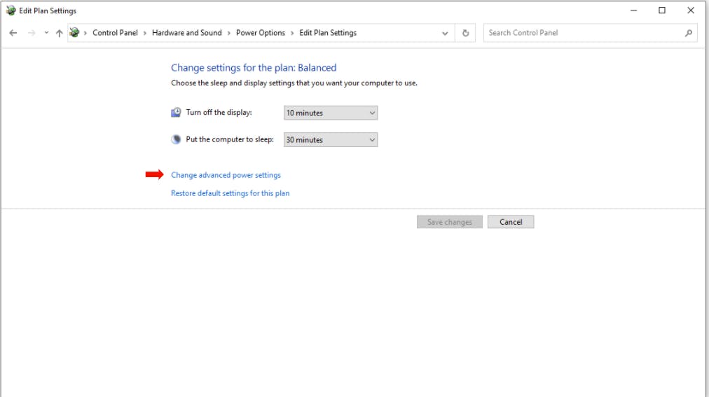 Under the “Put the computer to sleep:” dropdown, click the “Change advanced power settings” link.