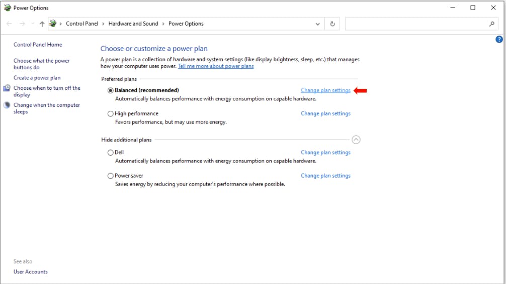 Under “Preferred plans,” click the “Change plan settings” link to the right of “Balanced (recommended).