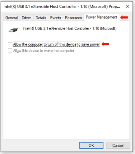 Under the “Power Management” tab, uncheck the box next to “Allow the computer to turn off this device to save power” and click the OK button at the bottom.
