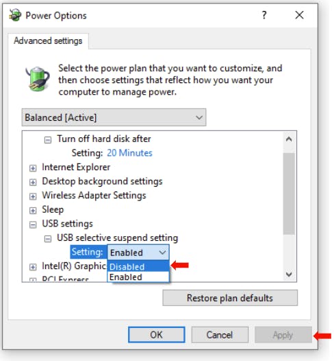 Expand “USB settings” by clicking the + button, then expand “USB selective suspend setting.” In the “Setting:” dropdown, select “Disabled,” then click the Apply button on the bottom right of the window.
