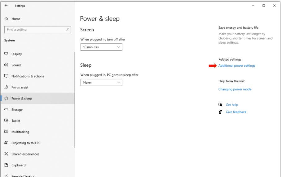 Under “Related settings” on the right, click the “Additional power settings” link.