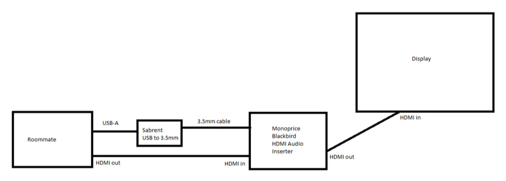 This configuration provides a discrete audio output from RoomMate over USB, which can then be recombined with the HDMI output from the RoomMate's built-in HDMI port, to be sent onward to the display as follows: