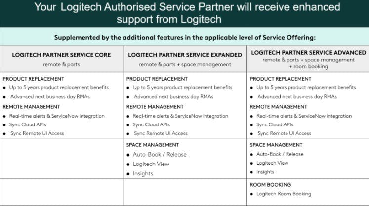Logitech Services are offered at three levels of Service as outlined further in this Services Description document and are purchased by reference to a category of Space such as Room or Flex Desk or through an Enterprise Plan (where available for that category of Space).