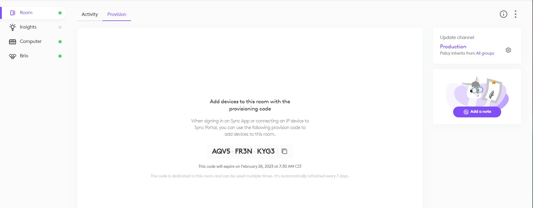 You can use provisioning codes to simplify the process of adding CollabOS devices to Sync. To add a CollabOS device to Sync using a provisioning code, you will first need to generate a code in the Sync Portal and then enter the code when asked in: