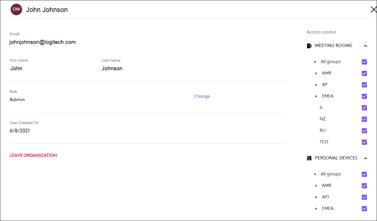 Users and Room/Desks and device management: Can add rooms/remove rooms from their organization, but cannot manage users. They can configure and update devices. They cannot modify groups or update channels.